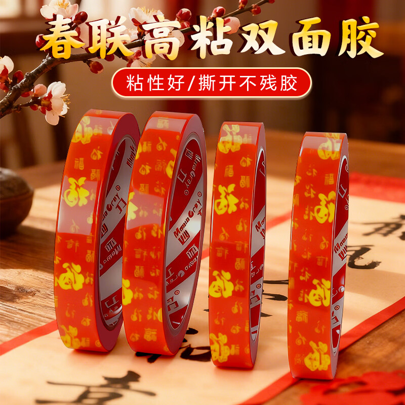MEEIAOREY春联专用双面胶福字红色胶带春联双面胶高粘度对联无痕胶结婚婚房婚车年画专用强粘无痕双面胶胶逞 春联福字双面胶【1.5厘米宽8米长】足米/不虚标 2卷